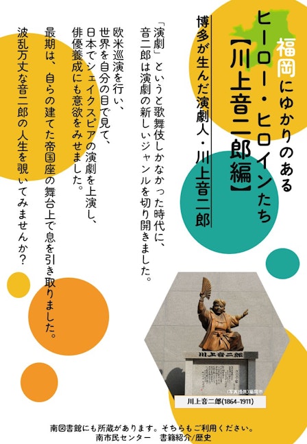 書籍紹介(歴史)「福岡にゆかりのあるヒーロー・ヒロインたち【川上音二郎編】」の展示を始めました。 2025年11月1日 共通 書籍紹介(歴史)「福岡にゆかりのあるヒーロー・ヒロインたち【川上音二郎編】」の展示を始めました。